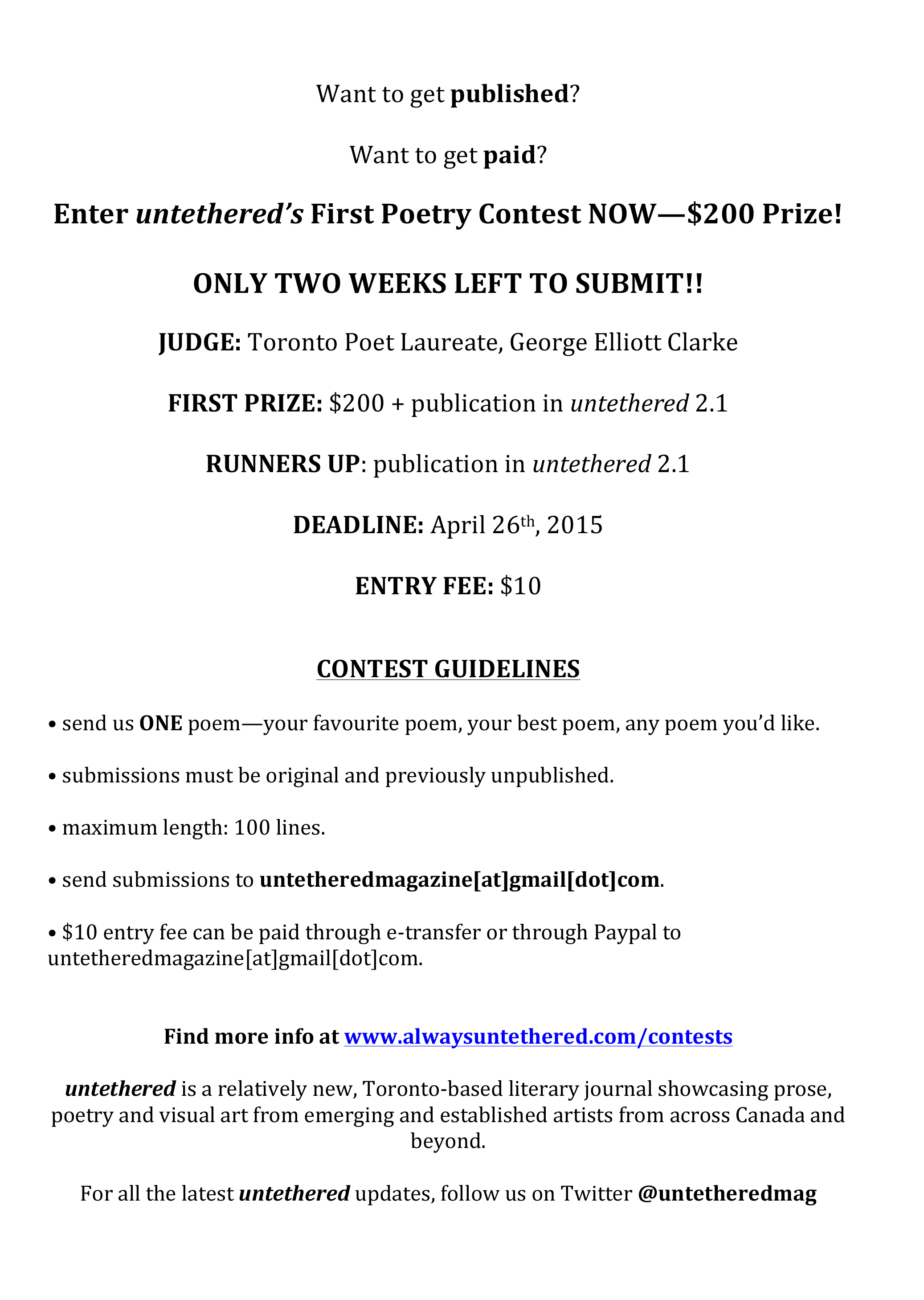 Less than TWO WEEKS until our poetry contest deadline! We’re fifteen days into National Poetry Month, so that means you’ve written fifteen new poems so far, right? Right? Send us your favourite poem and you could WIN $200! Judge: Toronto Poet Laureate, George Elliott Clarke Deadline: April 26th, 2015 Share this: Click to share on X (Opens in new window) X Click to share on Facebook (Opens in new window) Facebook Like Loading...