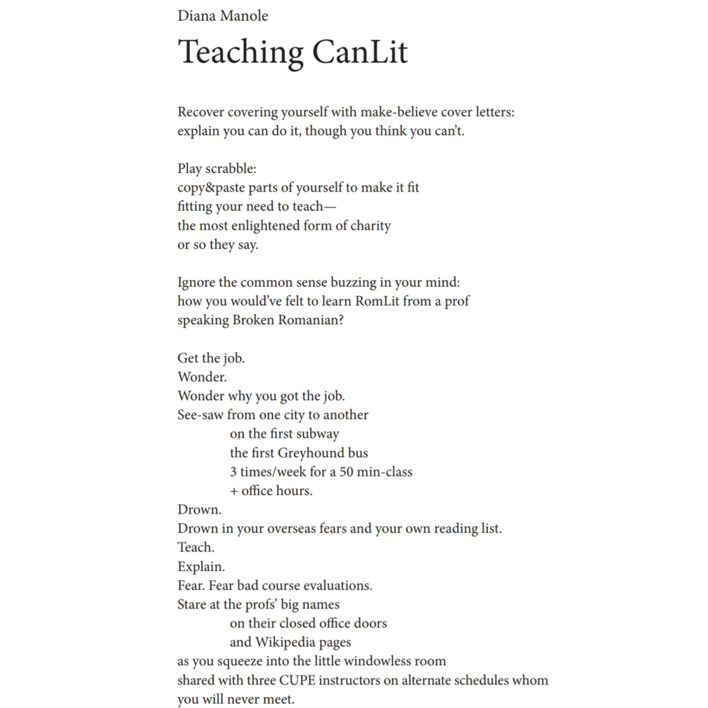 Diana Manole is a Romanian-Canadian scholar, writer, literary translator, and author of nine collections of poems, short prose, and drama in her home country. The winner of the 2020 Very Small Verse Contest of the League of Canadian Poets, her poetry has been published in the UK, the US, Belarus, Mexico, Brazil, South Africa, Turkey, Albania, China, Romania, and Canada. Her poetry book, Praying to a Landed-Immigrant God, is forthcoming from Grey Borders Books and can be pre-ordered online. Holding a doctorate from the University of Toronto, Diana teaches theatre, literature, and creative writing at universities in Ontario.