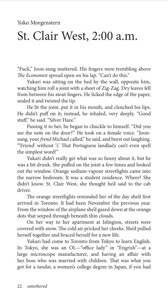 Yoko Morgenstern is originally from Tokyo. She started writing fiction while she was living in Canada, inspired by many writers who wrote in a second language. She is the author of two books in Japan and the United States, the translator of the novelist Katherine Govier, and a columnist at Newsweek Japan. Her literary work has appeared in journals in the US, UK, Canada, and India. Her yet-published short story collection, A Perfect Day to Die, which includes “St. Clair West” from untethered, was among the finalists for Eyelands International Book Awards 2019, Greece, and she’s looking for representation for the project. “The Comedian,” published in Flash Fiction Online in 2018, was also featured by Book Riot. Currently, she lives in Nuremberg, Germany.