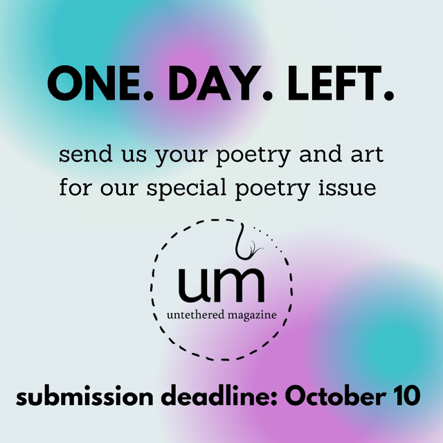 Just one day left to submit your work for our upcoming issue, issue 12! Send your best poetry and visual art by Sunday, October 10th! See Submission Guidelines for details.