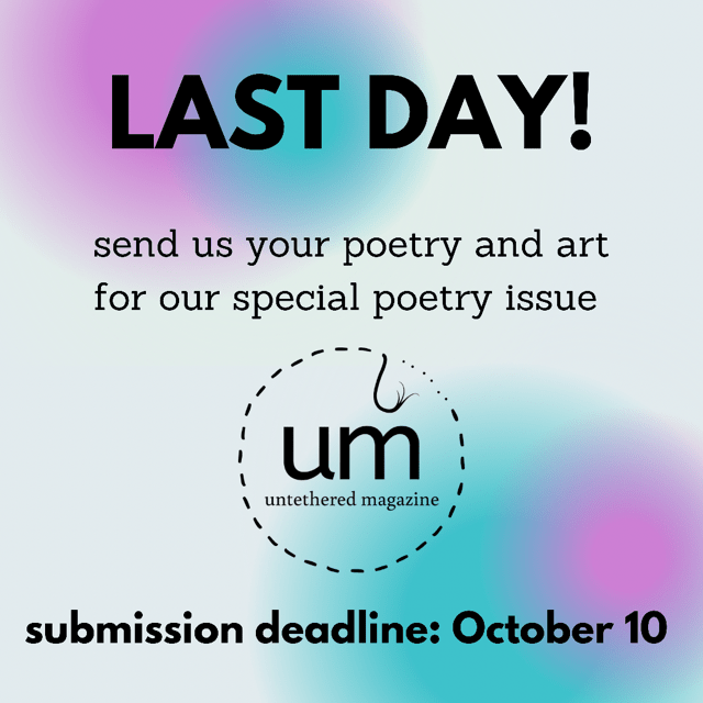 Time’s almost up! Just 24 hours to submit your best poetry and visual art for consideration in our upcoming issue, issue 12! See our SUBMISSION GUIDELINES for details.