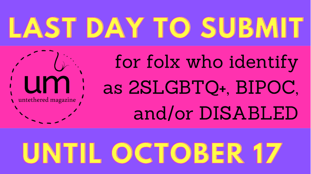 Our current submission period has been extended for folx who identify as 2SLGBTQ+, BIPOC, and/or DISABLED. Send us your poetry and visual art by midnight on October 17.