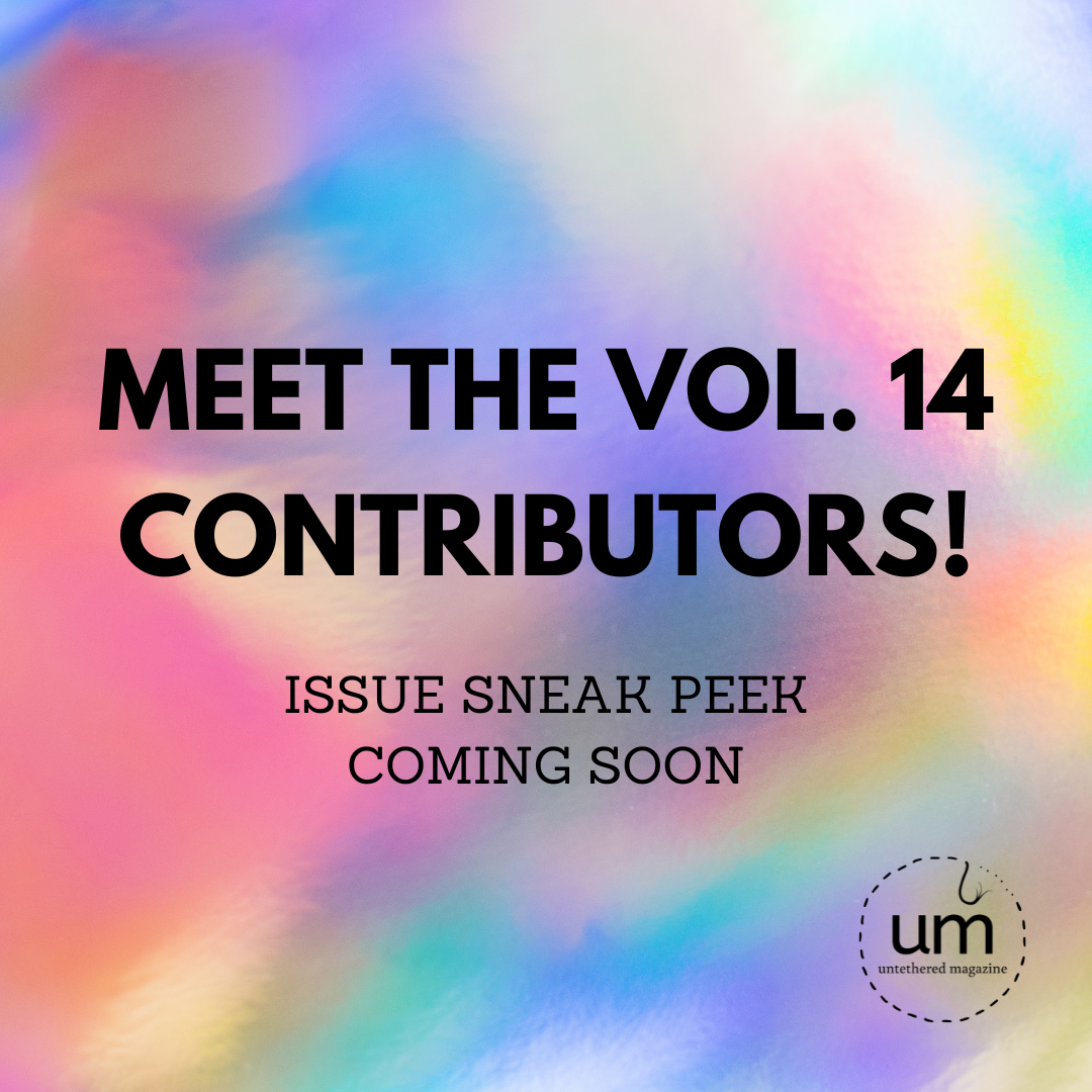 MEET THE CONTRIBUTORS OF VOL.14! We are so excited to announce the Vol.14 contributors! Over the next 18 days we’ll be featuring each contributor here and on all our socials. So be sure you’re following us (@untetheredmag)!